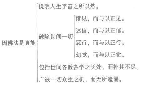 今能了解佛法之全系统及其真精神所在,则常人谓佛教是迷信是消极者,固可因此而知其不当。即谓佛教为世界一切宗教中最高尚之宗教,或谓佛法为世界一切哲学中最玄妙之哲学者,亦未为尽理。