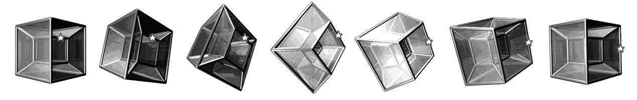 为方便观察,上面这组图片中的某一条棱上被打上了“☆”标记,请参考它的位置变化来想象:超正方体最中间的那个小正方体逐渐向画面右边鼓出来,再逐渐向外伸展,然后向着左后方把其余部分吞进去、包裹起来,最后看似又回到最初的模样,不过此时最里面的已到了最外面、最外面的到了最里面。这传递出一个理念:超正方体是无边界的(关于四维的景象,后面还会有专门章节介绍)。
