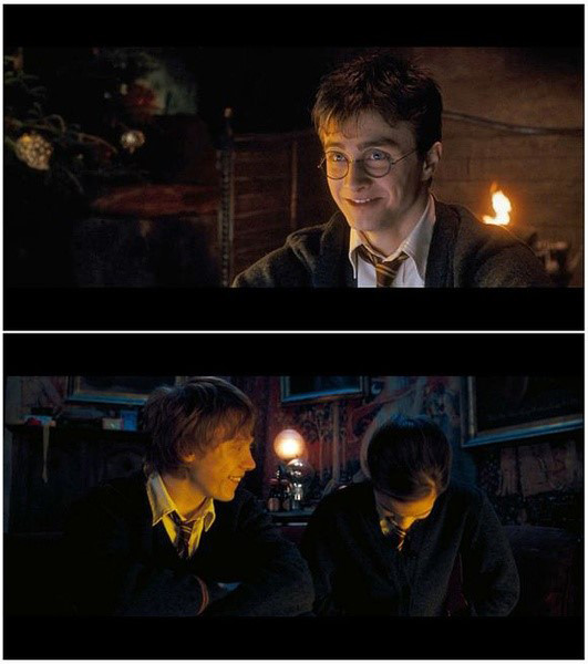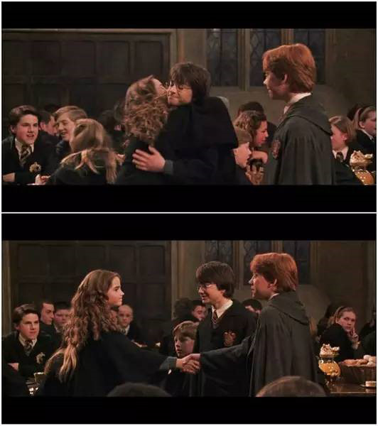 【拥抱与握手】这个细节很明显但是很有趣。HP2电影的结尾,石化的赫敏被治好了回到了伙伴身边。赫敏高兴地跑向哈利并拥抱,到了罗恩的时候,两人停住了,然后小尴尬地装作大人一样握了握手。电影剧组本来是计划赫敏与哈利罗恩都拥抱一下。但是这个握手,反而挺有爱的。