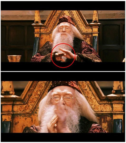 HP1电影中分院仪式时,别的孩子被分院之后,邓布利多的鼓掌方式如图一。这是长辈对晚辈的鼓掌方式。等麦格教授喊出哈利的名字,邓布利多有一个起身坐正的小动作;哈利被分到格兰芬多之后,邓布利多同他人一样热烈鼓掌(图二),足见对哈利的重视。