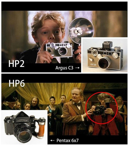 HP系列中大部分过于古老,但两款相机是摄影发烧友们熟悉的。HP2第33分30秒科林克里维的相机是美国产Argus C3 Matchmatic相机(1944~1966年创下销售记录)。HP6第1小时11分30秒,斯拉格霍恩的舞会上,著名的中画幅相机宾得6x7。