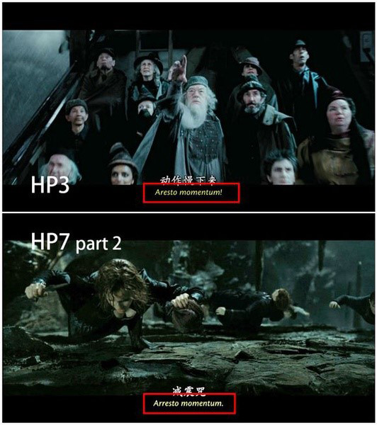 【Arresto Momentum】减震咒,HP3第56分26秒,比赛中的哈利遇到了摄魂怪从高空坠落,邓布利多使用了这个咒语救了哈利。而在第七部part2中,哈利罗恩赫敏拉环在古灵阁的地下金库从高空坠落,赫敏使用了同样的咒语,救了大伙儿一命。