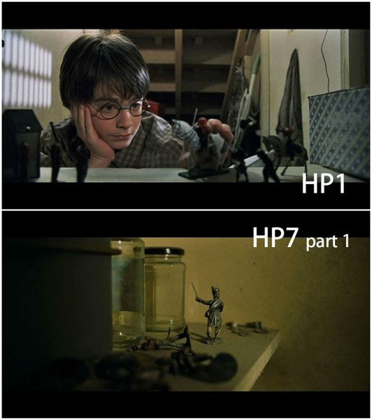 【碗橱岁月】HP1开始,小哈利在碗橱里玩士兵“手办”(不过仔细观察,这些士兵好像没有头)。第七部哈利将离开女贞路4号,最后看了一眼这个童年的住所,已蒙上了时间的灰尘。而放在那里的小士兵的摆放值得回味:其他的都倒下了,只有一个士兵,还举着武器孤独地向前冲锋。