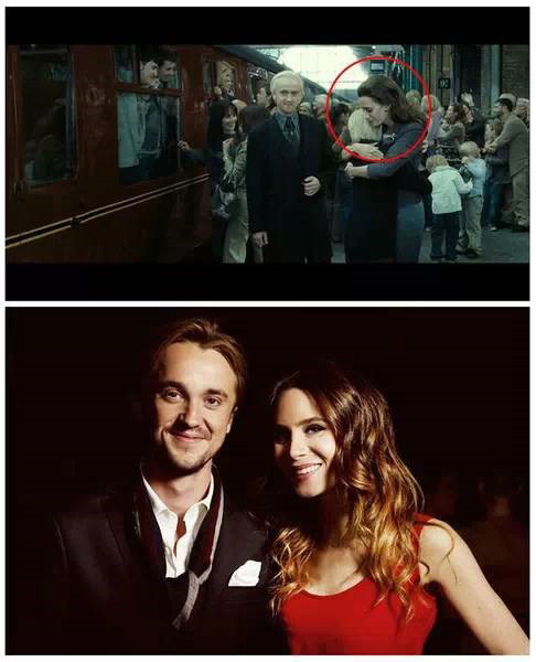 【德拉科·马尔福的妻子】电影最后一部大结局,十九年后,观众也瞧见了德拉科·马尔福一家人。注意马尔福的妻子阿斯托利亚·马尔福(画面红圈处)。她的扮演者,就是麻瓜世界中德拉科的扮演者Tom Felton的女友,Jade Gordon。