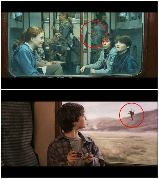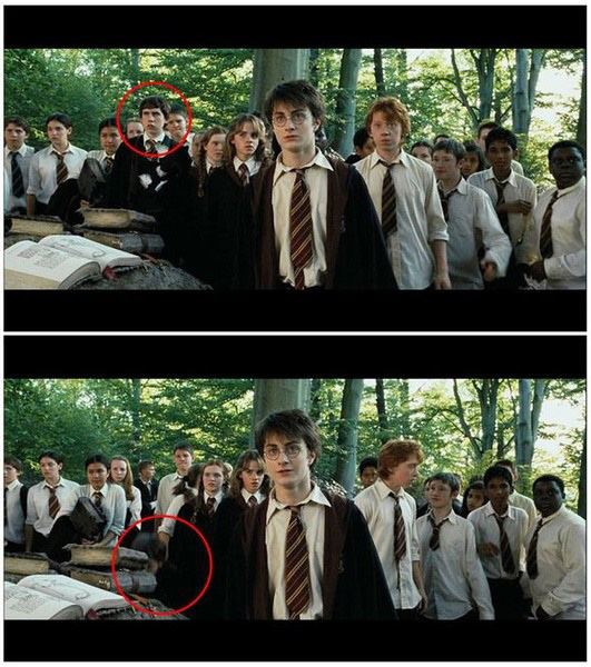 【笑场】HP5电影1小时07分半处,哈利罗恩赫敏讨论哈利的初吻。最后三个人都笑了。实际上,这里是三个小演员笑场了,不过导演觉得这样反而挺好,于是就把笑场的部分加入到影片之中。