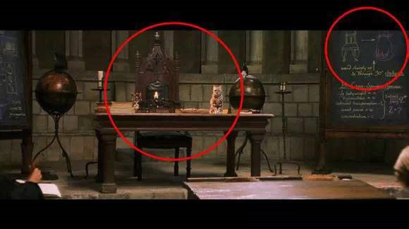 【椅子与猫】HP1电影第50分50秒,哈利与罗恩迟到了,慌张跑进麦格教授的课堂。他们看到空空的椅子和一只喵星人。注意画面右侧的黑板上,画着的也是一个椅子和喵星人:一把椅子→一只猫。实际场景与黑板上的场景很一致,结合起来有莫名的萌感。