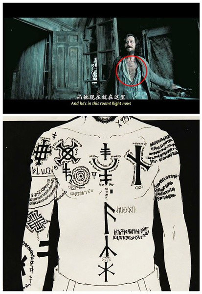 【小天狼星的纹身】HP3小天狼星现身,衣衫褴褛露出胸膛,露出纹身。如果你去电影的主题展览馆或者在一些纪念册上还可以见得到,小天狼星纹身的完全展示图(如图)。据说小天狼星的纹身来源于俄罗斯监狱的黑帮。