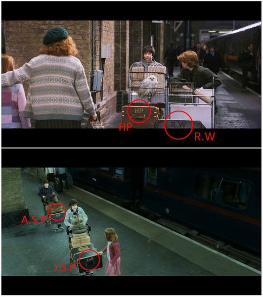 哈利的行李箱上有名字缩写HP,罗恩行李箱上有R.W。最后一部末尾,哈利的三个子女出现,两个儿子的行李箱上是全名缩写,James Sirius Potter,Albus Severus Potter。女儿还未到入学年龄,Lily Luna Potter。