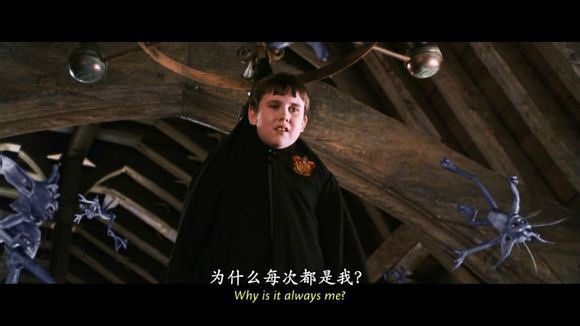 HP2第38分,洛哈特的课上康沃尔小精灵大闹,纳威被苦逼地吊在了空中。他无奈地说:“Why is it always me?”这句台词成了经典。扮演者Matthew Lewis访谈时说一直有粉丝让他签名时题上这句话。