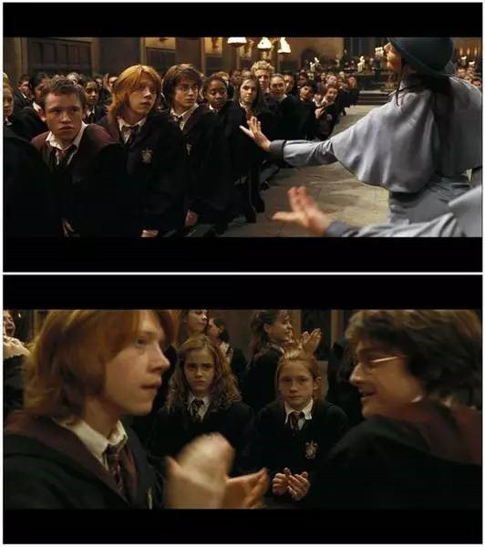 HP4第17分钟,布斯巴顿学院的妹纸们出场,让霍格沃茨的汉子们兴奋不已。哈利直接站起来鼓掌,罗恩喃喃Bloody Hell处于痴呆状。赫敏和金妮一脸嫌弃地看着他俩。N年后赫敏和金妮各自嫁给了坐在自己正对面的小伙儿。而布斯巴顿学院代表芙蓉则成为了他们的嫂子。