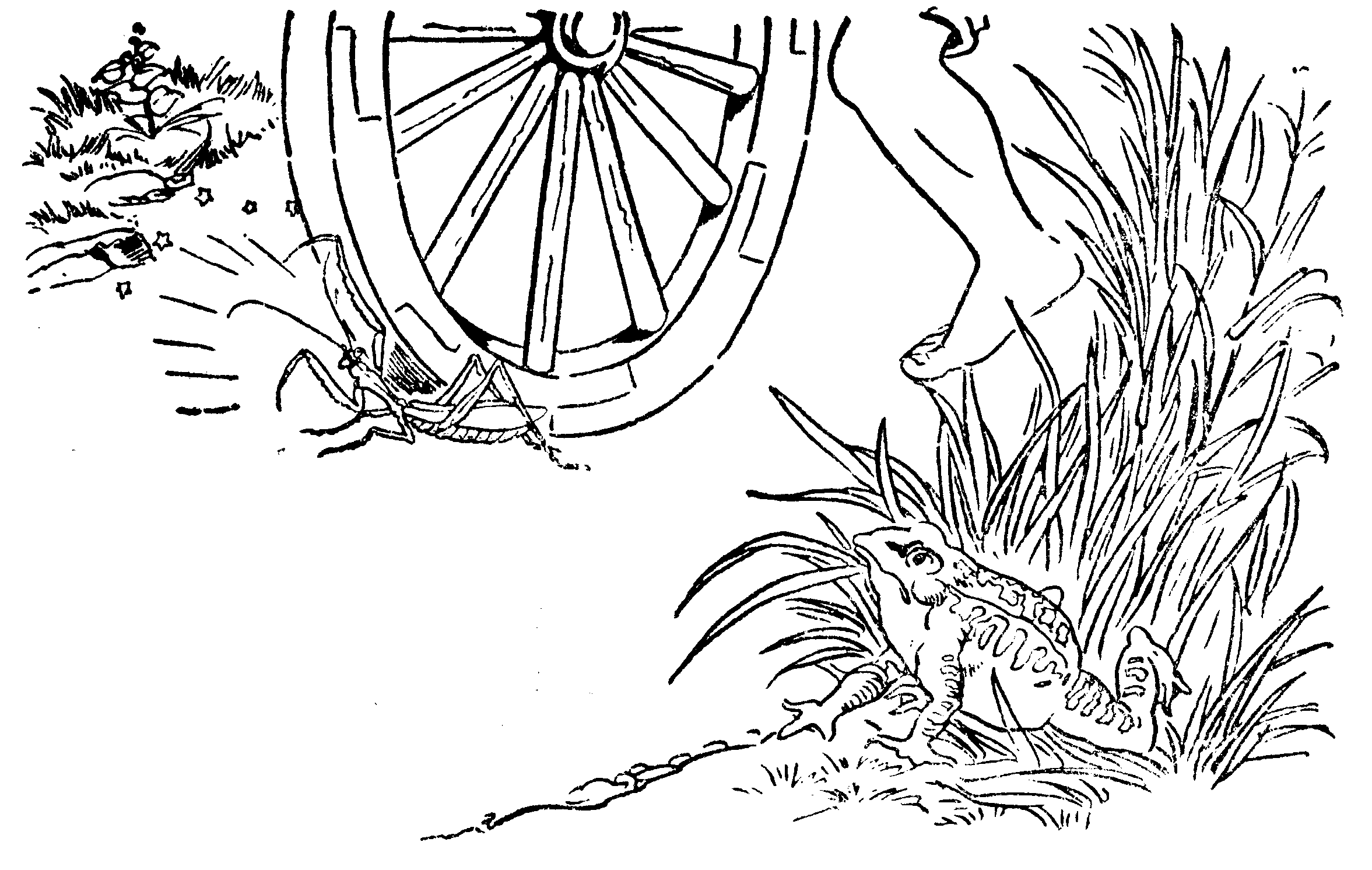 车轮更近过来了,蛙大哥劝螳螂将军不听,就跳到路旁的草堆中躲了起来,一面从草的缝隙中窥视着。