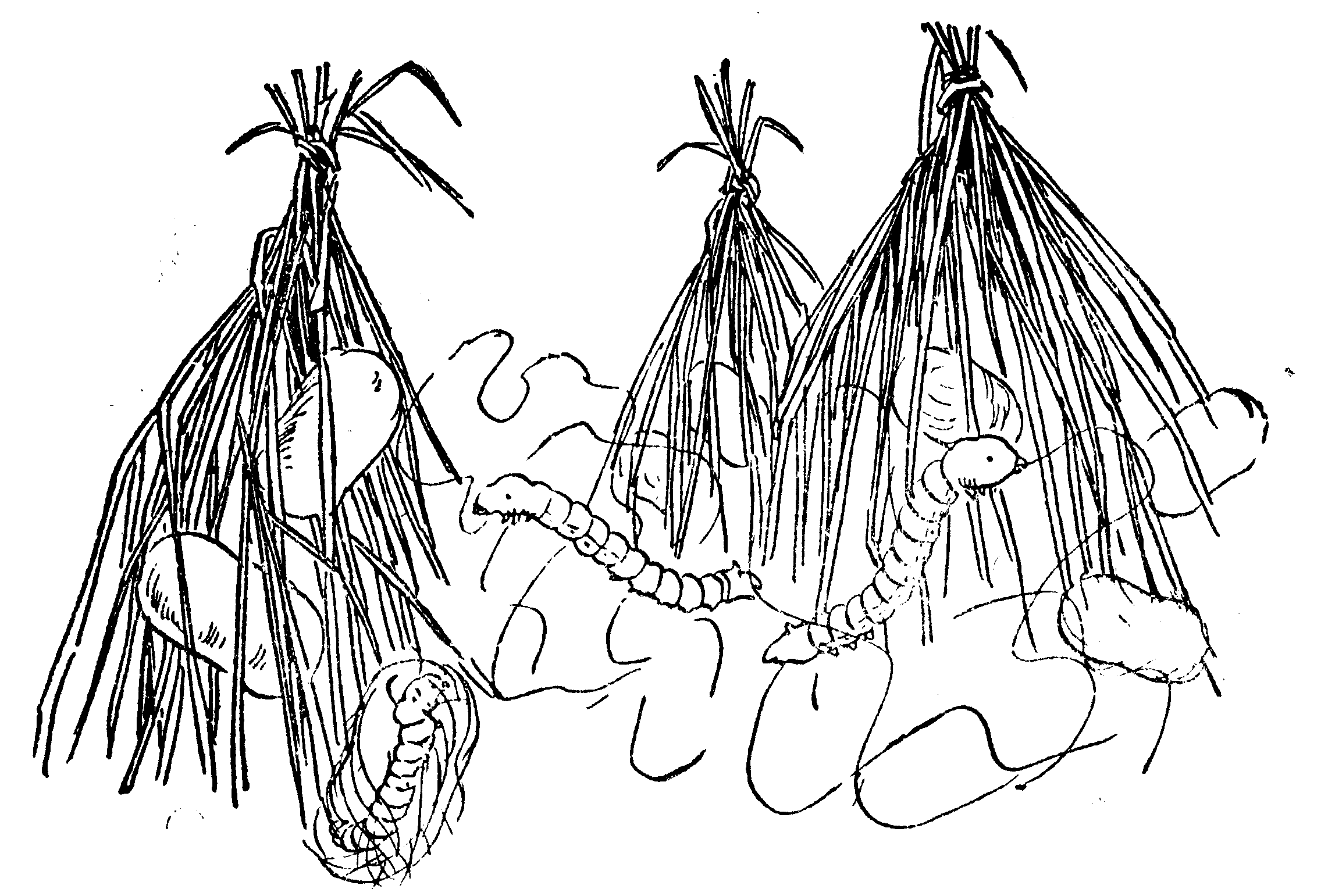 又过了两天,几条比较大一些的蚕宝宝不要吃桑叶了,嘴里在吐出一丝一丝白的东西来。主人看见后,欢喜的说:“蚕宝宝在作茧了。”接着,就把他们放在预备好的草笑话簇上。