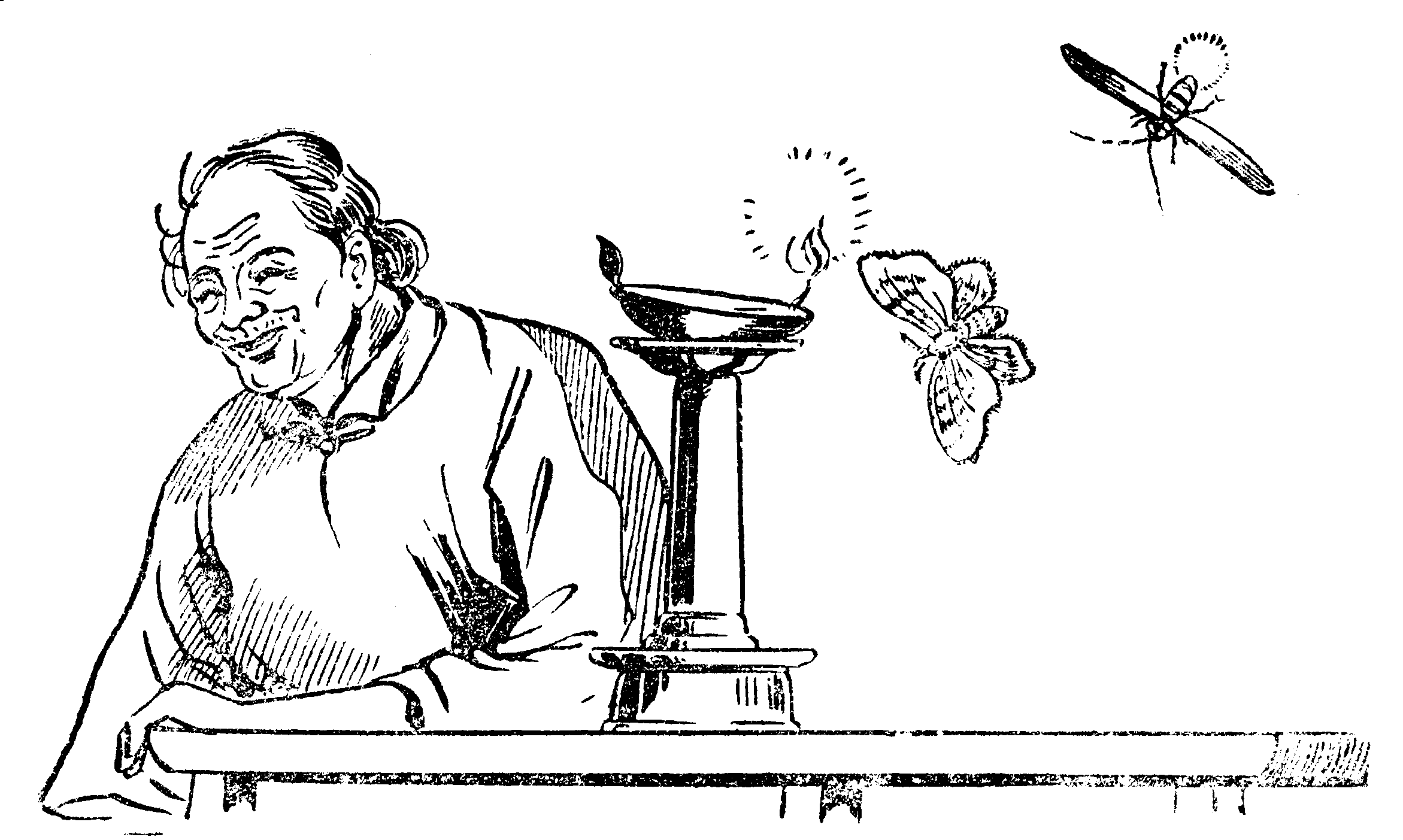 飞蛾欢喜得非常,又奋起翅膀,向着灯芯很快的飞舞过去。