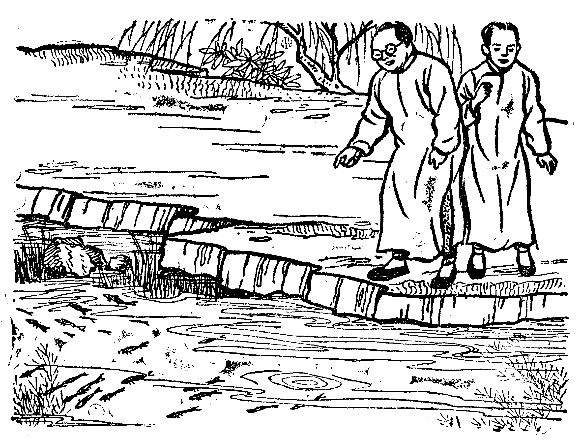 以后,经过池塘的人,见了如此澄清的水,不免都赞叹一声:“好清的水!”接着,他们又会加上一句:“这好多鱼!”