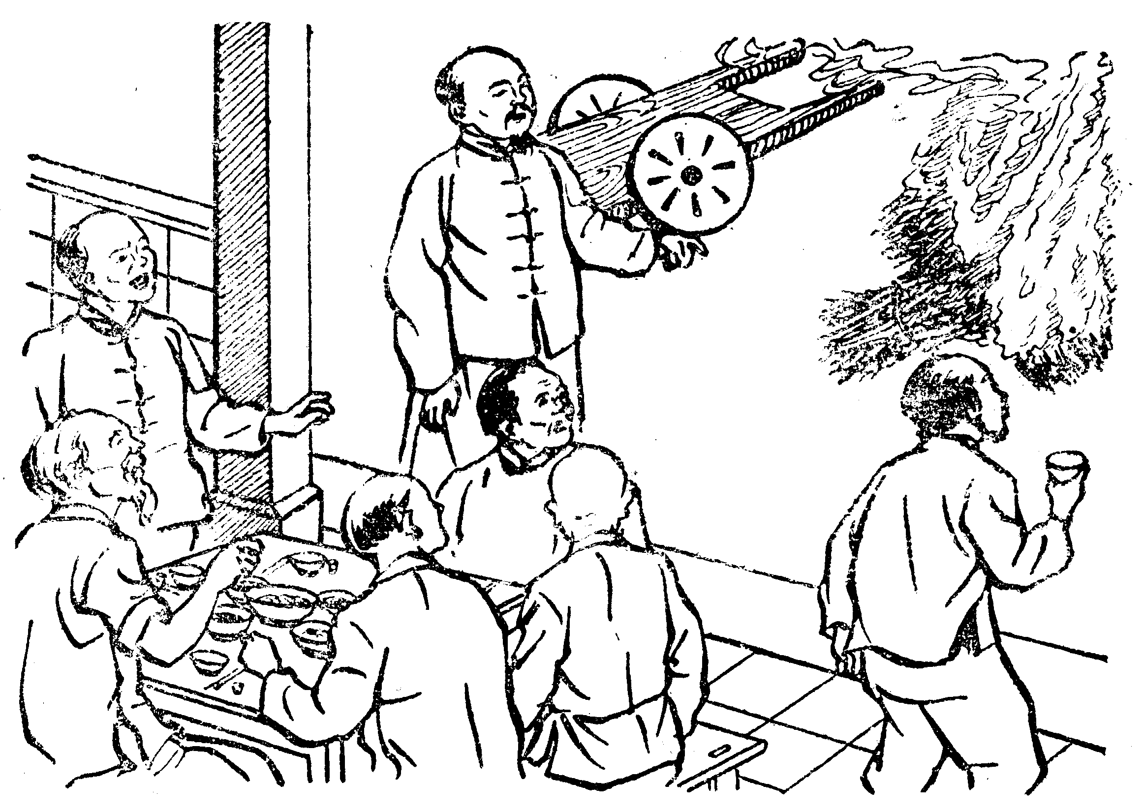 一天,他邀集了许多亲邻,请他们喝酒吃饭,吃饭的中间,富翁家里的工人把一车薪,车进门来,把它堆在阶下,富翁便命令着工人用火燃薪。不多时,火光熊熊,全车的薪都烧起来。富翁又命令工人说:“你快用我的酒杯,舀一杯水去浇灭它!”工人想,“这不是癫了吗?”他笑着,舀了一杯水去浇那猛烈的火。自然,火仍旧是熊熊地,而且越烧越猛烈。于是亲邻大家笑了说:“一杯水那能浇灭一车薪的火?”