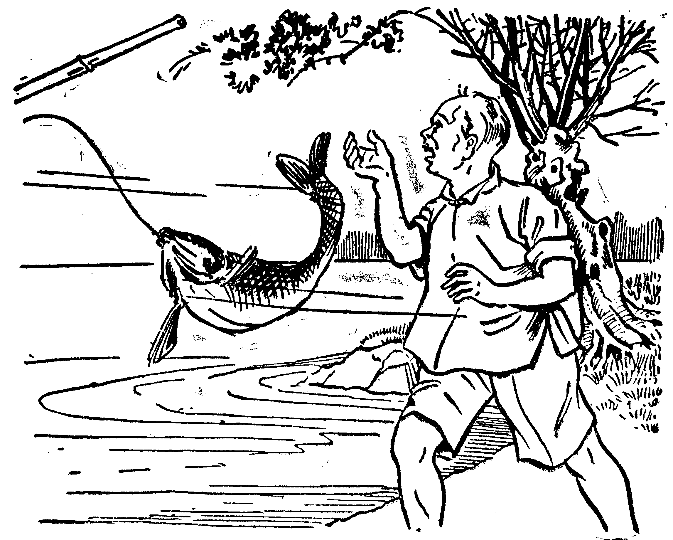 阿大很不高兴。正想回家去的时候,忽然有一条很大的鱼撞在鱼筌上被钩住了。