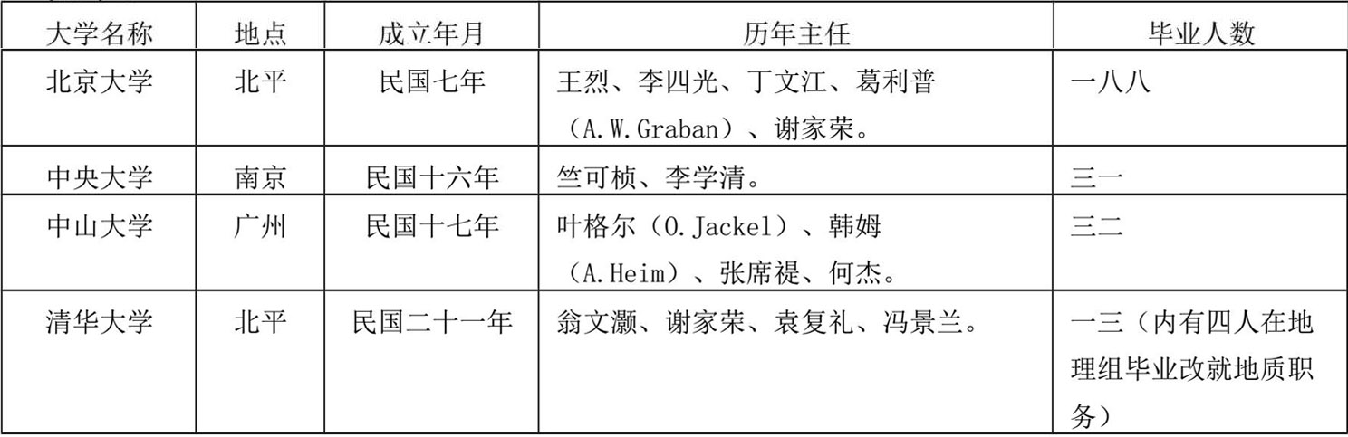 到民国七年,北京大学首先恢复一个地质学系。十六年,南京中央大学地学系分地质及气象二门,十九年春,地学系分为地质学、地理学二系。又十七年,广州中山大学重设地质学系(该系初剏于民国十四年,嗣因人数不足停办)。又十六年,北平清华大学始设地质课程,十八年,设地理学系,二十一年改地学系分地质、地理、气象三组。又闻四川重庆大学于本年添设地质学系。自民国七年后,地质教育事业始由各大学次第举办,是为正式时期。今除重庆大学之地质学系开办伊始暂不计入外,就其余各大学之地质学系史略简单列表如下: