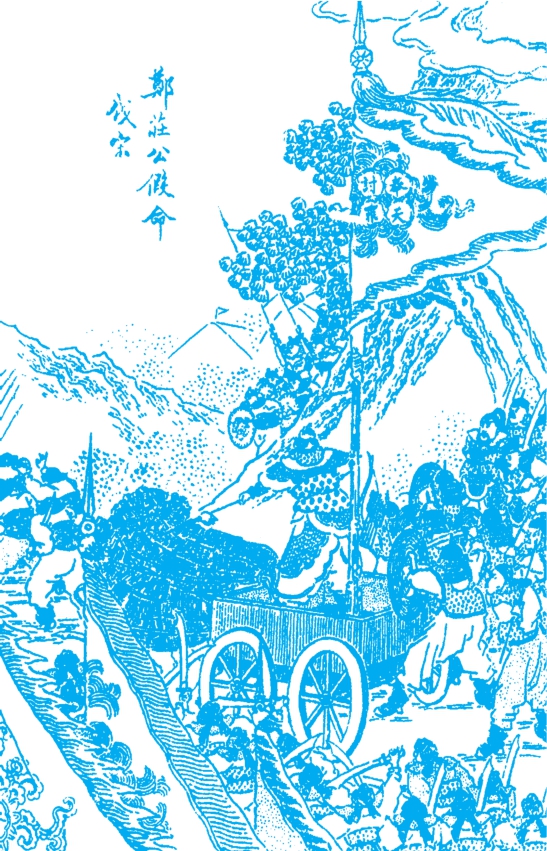 郑庄公亲统着公子吕、高渠弥、颍考叔、公孙阏等一班将士,自为中军。建大纛一面,名曰“蝥弧”,上书“奉天讨罪”四大字,以辂车载之。将彤弓弧矢悬于车上,号为卿士讨罪。夷仲年将左军,公子翚将右军,扬威耀武,杀奔宋国。公子翚先到老桃地方,守将引兵出迎,被公子翚奋勇当先,只一阵,杀得宋兵弃甲曳兵,逃命不迭,被俘者二百五十余人。公子翚将捷书飞报郑伯,就迎至老桃下寨。相见之际,献上俘获。庄公大喜,称赞不绝口,命幕府填上第一功。杀牛飨士,安歇三日,然后分兵进取。命颍考叔同公子翚领兵攻打郜城,公子吕接应;命公孙阏同夷仲年领兵攻打防城,高渠弥接应。将老营安扎老桃,专听报捷。