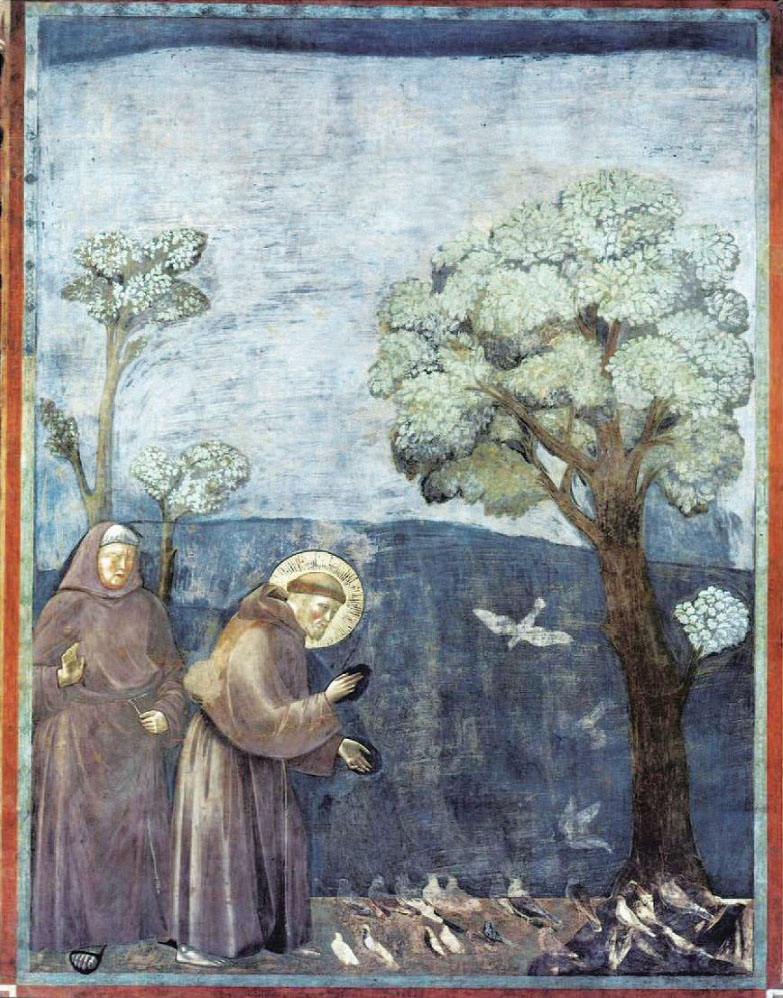 这种亲切的诗意最丰富的,要算是《圣方济各向小鸟说教》的那张壁画了。这个十分通俗的题材,曾被不少画家采用过;但从没有一个艺人,能像乔托那样把圣方济各的这桩天真的故事,描写得真切动人。十六世纪时韦罗内塞(Véronèse,梵罗纳士)画过《圣安东尼向鱼类说教》(《圣安东纳向鱼类说教》)。那是:一个圣者在暴风雨将临的天色下面,做着大演说家的手势,站在岩石上面对着大海。乔托的作品却全然不同:圣方济各离开了他的同伴,走到路旁,头微俯着,举着手,他正在劝告小鸟们“要颂赞造物,因为造物赐予它们这般暖和的衣服,使它们可以借此抵御隆冬的寒冷,并给予它们枝叶茂盛的大树,使它们得以避雨,得以筑巢栖宿”。小鸟们从树上飞下来,一行一行地蹲在他面前,仿佛一群小孩在静听“基督教义”功课。有的,格外信从地,紧靠着他;有的,较为大意,远远地蹲着。一切都是经过缜密的观察而描绘的。笨拙的素描中藏着客观的写实与清新的幻想。