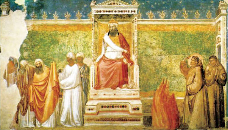 《圣方济各在苏丹廷上》那幅壁画,据当时的记载,有下列这样的一桩典故: