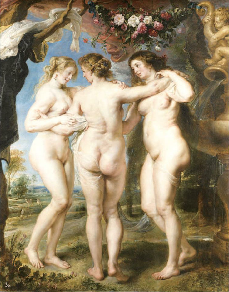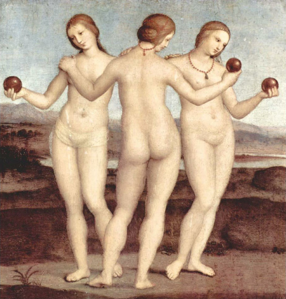 可是在大体上,“三女神”并无拉斐尔的富丽与柔和,线条也许太生硬了些,左方的两个女神的姿势太相像。然这些稚拙反给予画面以清新的、天真的情趣,为在更成熟的作品中所找不到的。