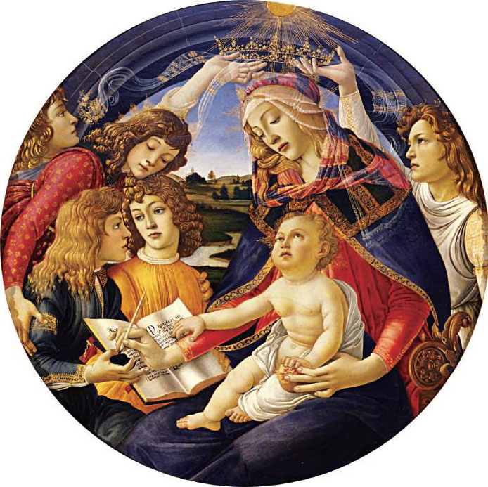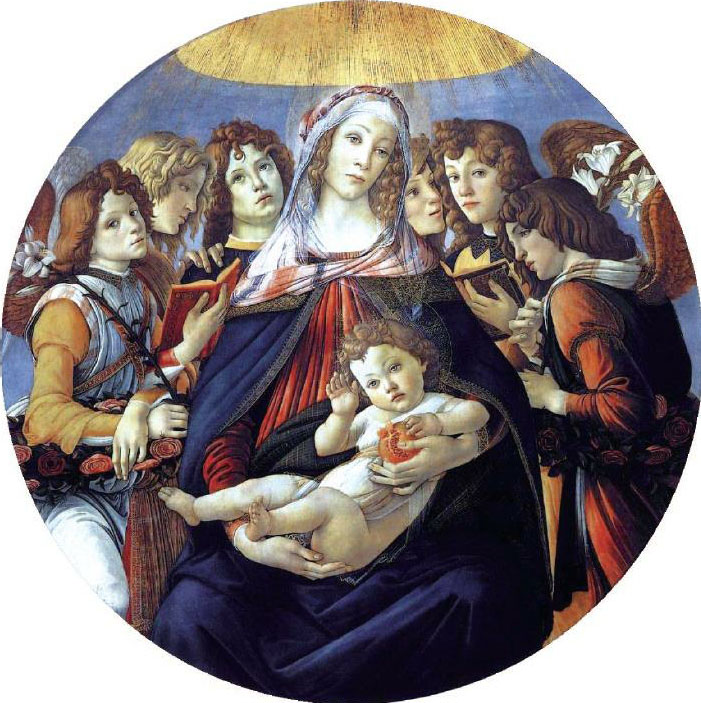 在Madone du Magnificat(《圣母像》)一画中,圣母抱着小耶稣,天使们围绕着,其中两个捧着皇后的冠冕。一道金光从上面洒射在全部人物头上。另外两个天使拿着墨水瓶与笔。背景是平静的田野。