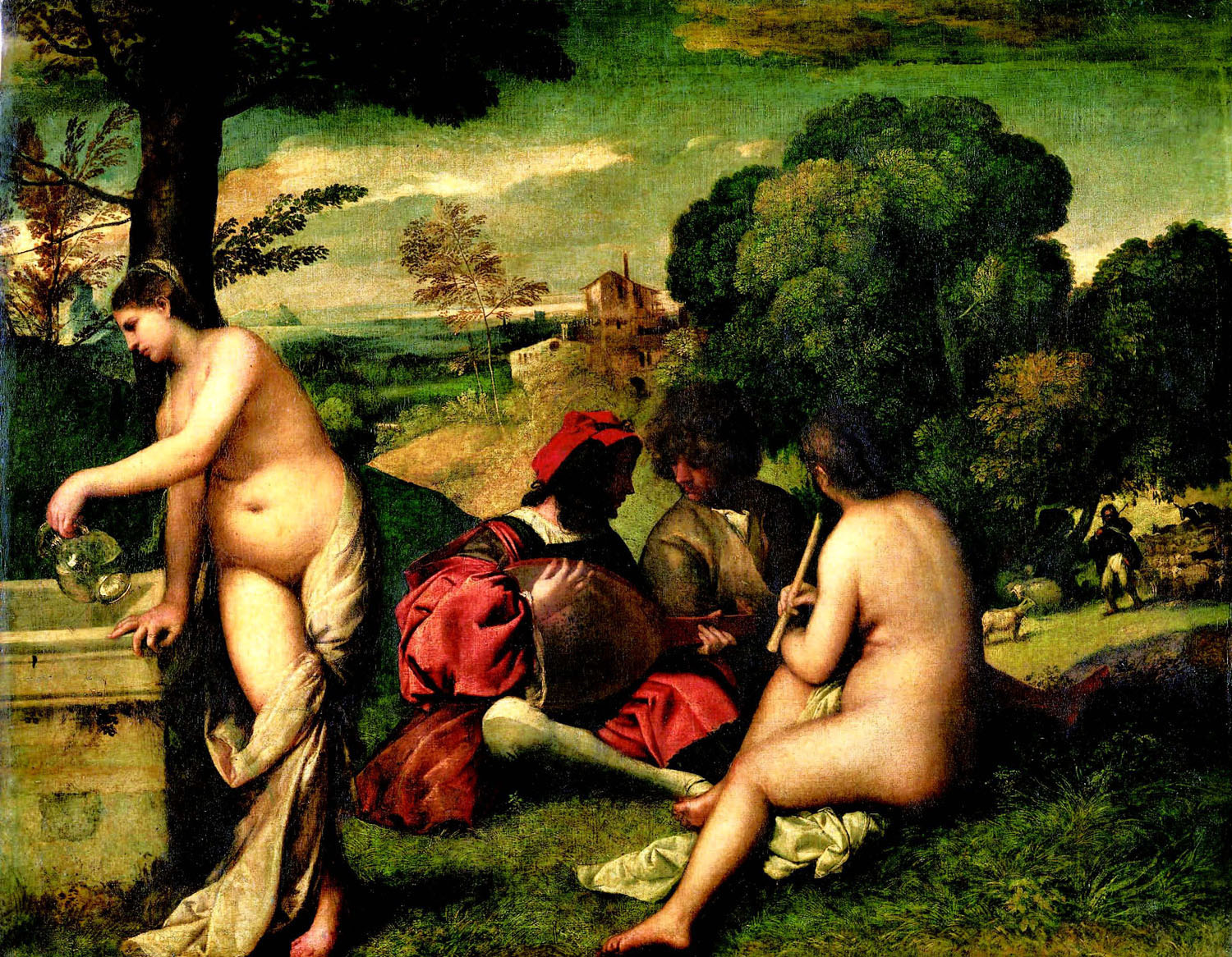 这个研究可以一直继续下去。我们可以注意在似烟似雾的青绿色风景中,用了何等的艺术手腕,以黑发与纱网来衬出这苍白的脸色。无数细致的衣褶,正是烘托双手的圆味,她的身体更贯注着何等温柔的节奏,使她从侧面旋转头来正视。
