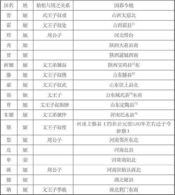 武王、成王两世,共封立了七十多个新国,其中与周同姓的有五十多国;但这七十余国而外,在当时黄河下游和大江以南,旧有国族之归附新朝或为新朝威力所不届的,大大小小,还不知凡几。在这区域内,周朝新建的和旧有的国,现在可考的有一百三十多。兹于现在可考的周初新建国中,除上面已提到的宋、卫、鲁、齐、燕外,择其可以表示周人势力的分布的十八国列表如下: