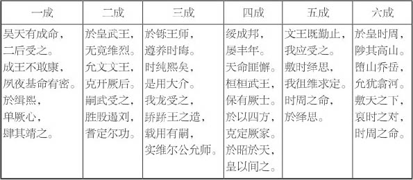 大武的舞姿,现在犹可仿佛一二,全部分为六节,每一节谓之一成。第一成象“北出”,舞者“总干(持盾)山立”;第二成象“灭商”,舞容是“发扬蹈厉”;第三成象南向出师;第四成象奠定南国;第五成象周公召公左右分治(周初曾把王畿分为两部,自陕而东周公主之,自陕而西召公主之,陕西省之得名由此),舞者分夹而进;第六成象军队集合登高,最后舞者同时坐下。六成各有相配的歌词,皆存于《诗经》中,兹引录如下: