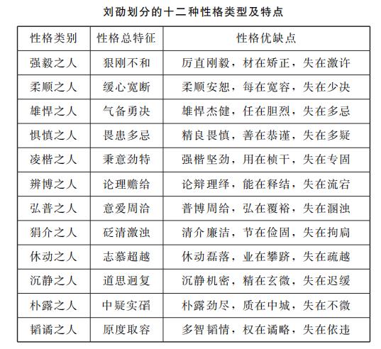 三国时刘劭对人的性格差异曾进行过深入的研究。他认为人与人在性格上相差十分悬殊。他将人的性格分为十二种类型:强毅之人、柔顺之人、雄悍之人、惧慎之人、凌楷之人、辨博之人、弘普之人、狷介之人、休动之人、沉静之人、朴露之人、韬谲之人,见下表。